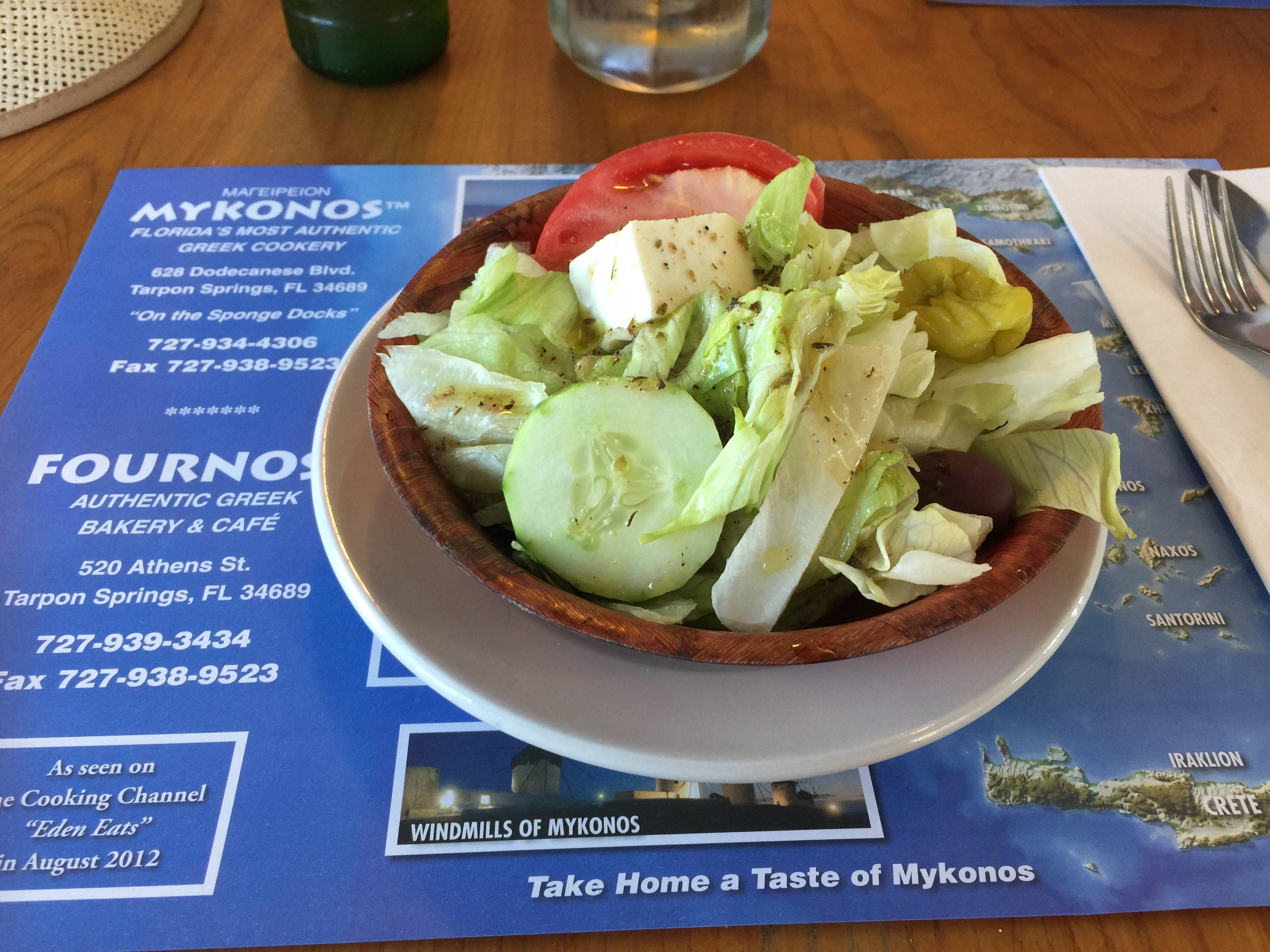 Ook buiten Europa vonden we sporen van de Griekse keuken. In Florida heb je zelfs een plaatsje aan de westkust, Tarpon Springs, dat voornamelijk bevolkt wordt door Grieken. Het is ooit ontstaan doordat aan het eind van de 19 e eeuw er duizenden Grieken naar toe emigreerden. Heden ten dage is het een toeristentrekker met veel Griekse winkeltjes en restaurantjes en sponzen. Uiteraard kun je daar lekker Grieks eten en dat hebben we dan ook gedaan. De eerste keer bij toeval, de tweede keer, jaren later toen we weer Florida bezochten, wel overwogen. Beide keren kregen we een gigantisch bord met verrukkelijk eten voorgezet dat we niet op konden. In restaurants over de grote plas vragen de obers regelmatig of je een “box” wilt, zodat het eten wat je niet op kan niet verloren hoeft te gaan. Hier hebben we dan ook gretig gebruik van gemaakt, zodat we het later op konden eten. Een dingetje…. warm het eten niet op in de meegekregen piepschuimbbox, want dat vindt de magnetron, die je bijna in elke hotelkamer in de USA aantreft niet zo’n succes. We probeerden het, want we hadden geen ander keukenmateriaal voor handen met een laag wattage en een korte tijdsduur. We hebben het eten er maar snel uitgehaald en lauw opgegeten. Ook in Nederland durven we tegenwoordig gerust om een doosje te vragen, want hoe zonde is het om al dat lekkers weg te moeten gooien?
